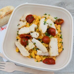 Poulet, pommes de terre, maïs en sauce Andalouse, tomates confites. -salade assaisonnée | 360 g | 8,20 € TTC (7,77 € HT) | ||