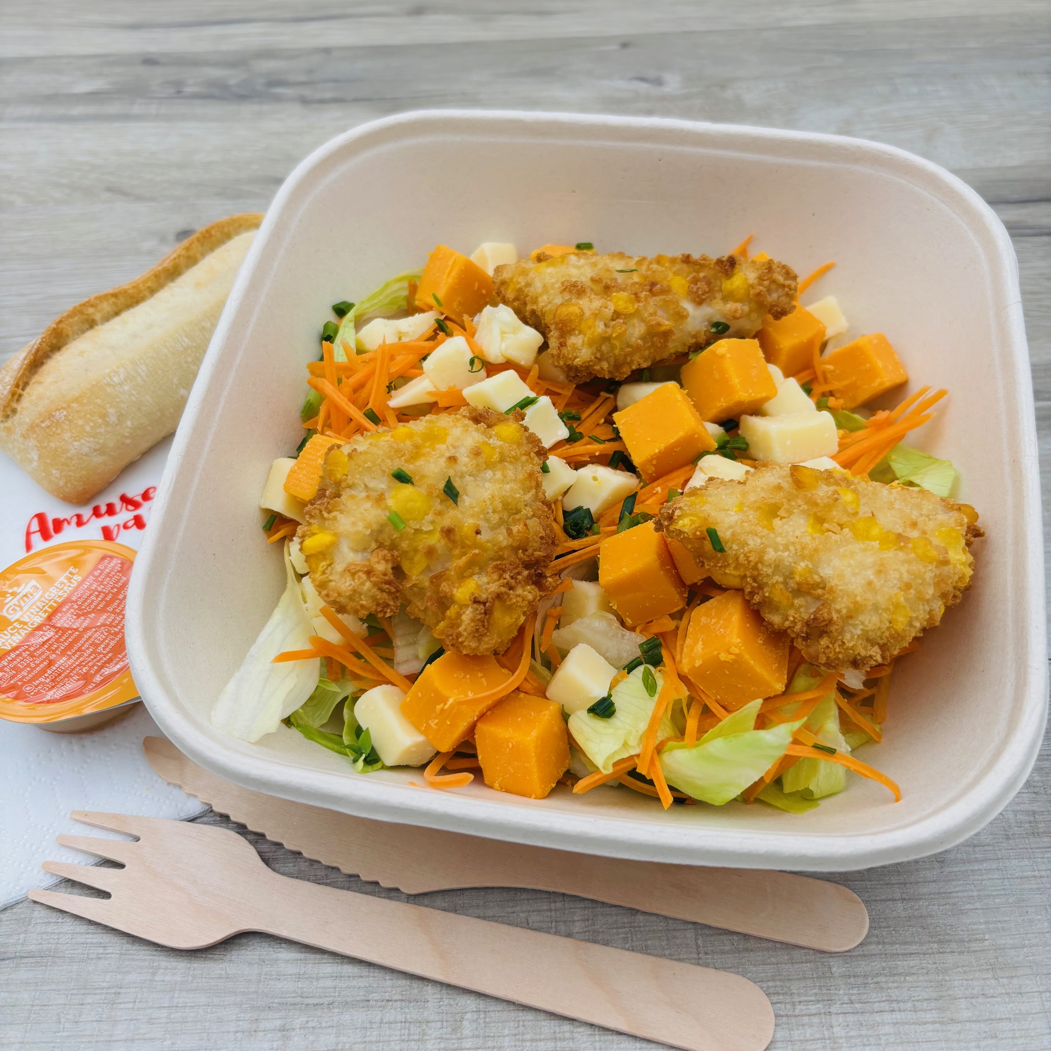 Salade, poulet pané aux céréales, carotte, emmental, mimolette.