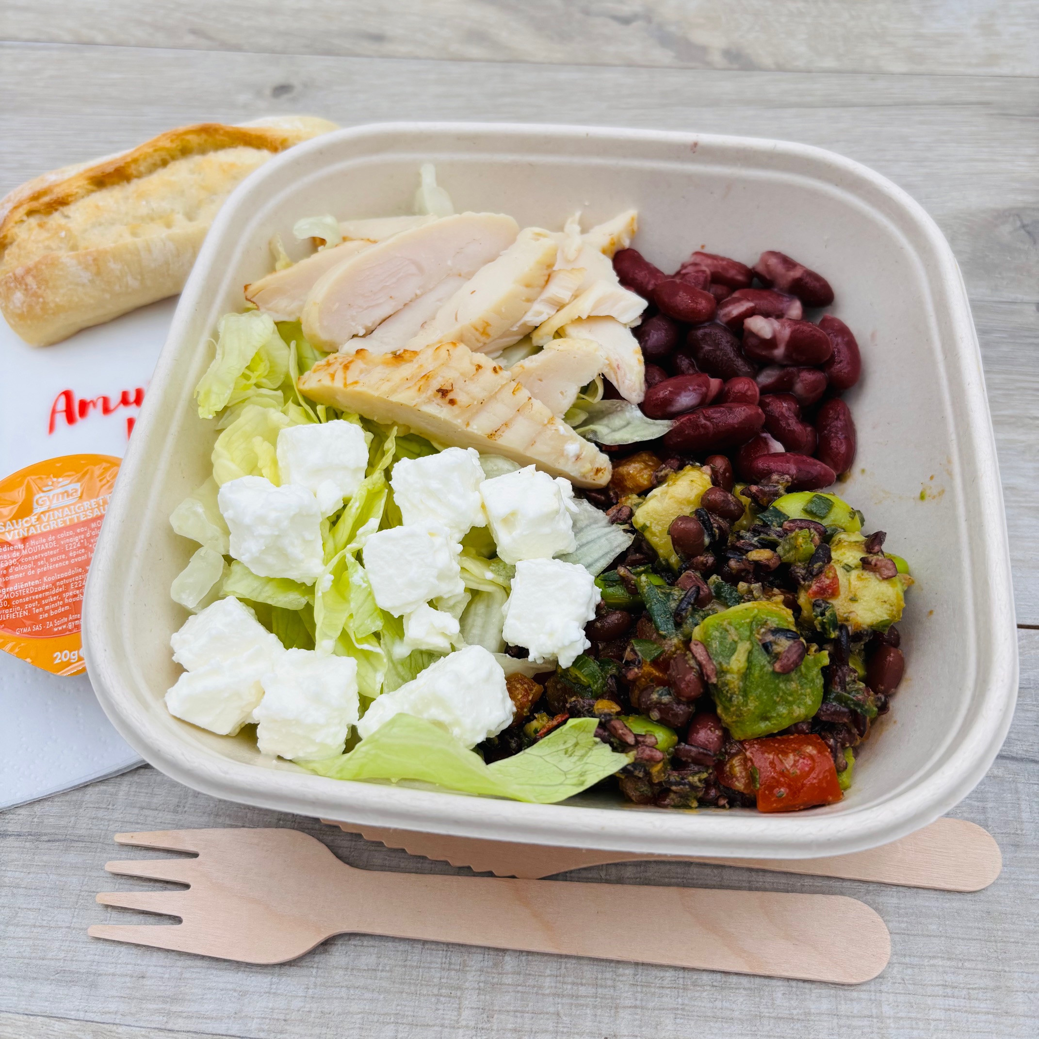 Salade composée de riz noir, tomate et avocat en cubes, haricot rouge du Japon « Azuki », fève de soja, oignon nouveau, féta, émincé de poulet rôti et sauce finement épicée.
