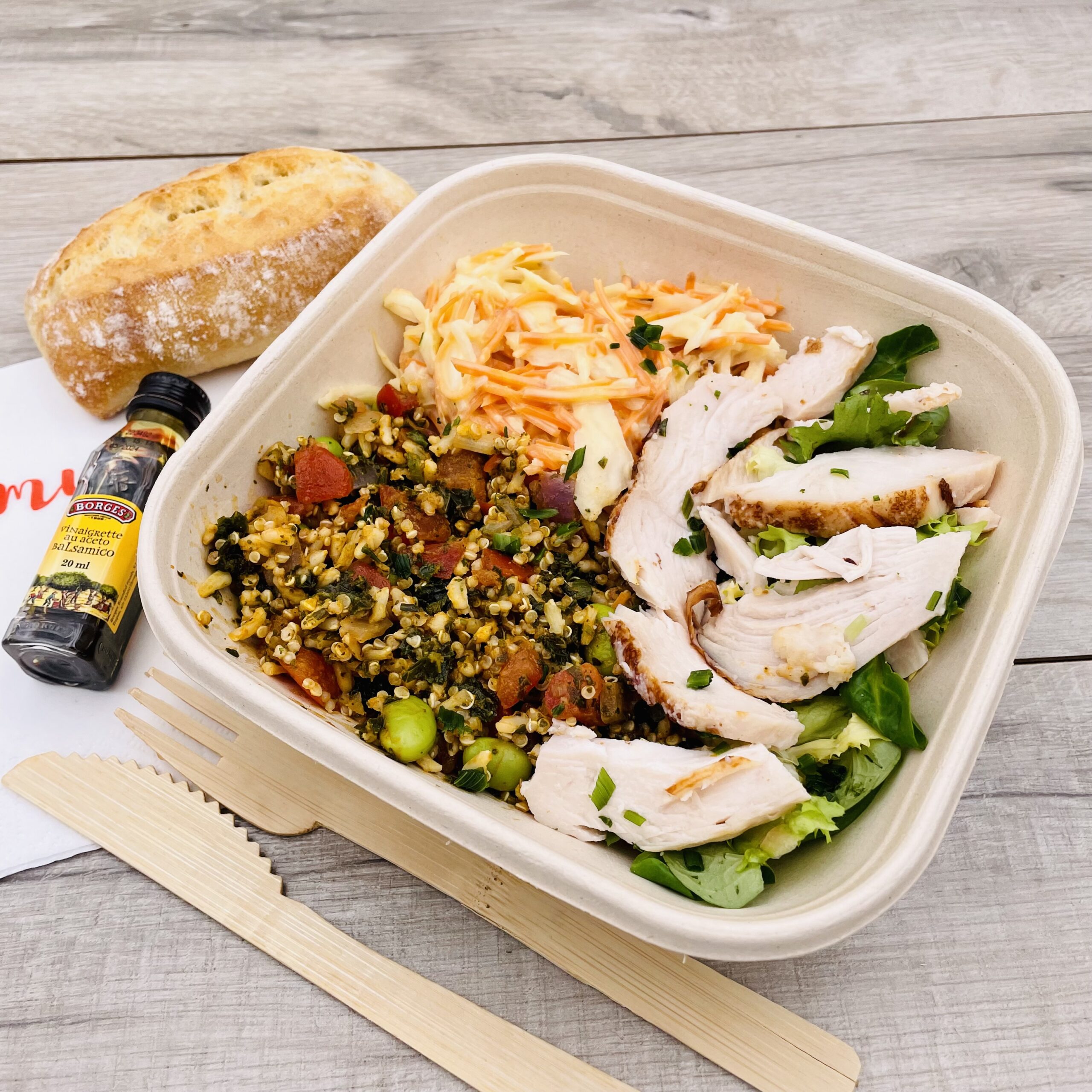Salade, poulet, coleslaw, mélange quinoa, riz brun, fèves, oignons, poireaux.
