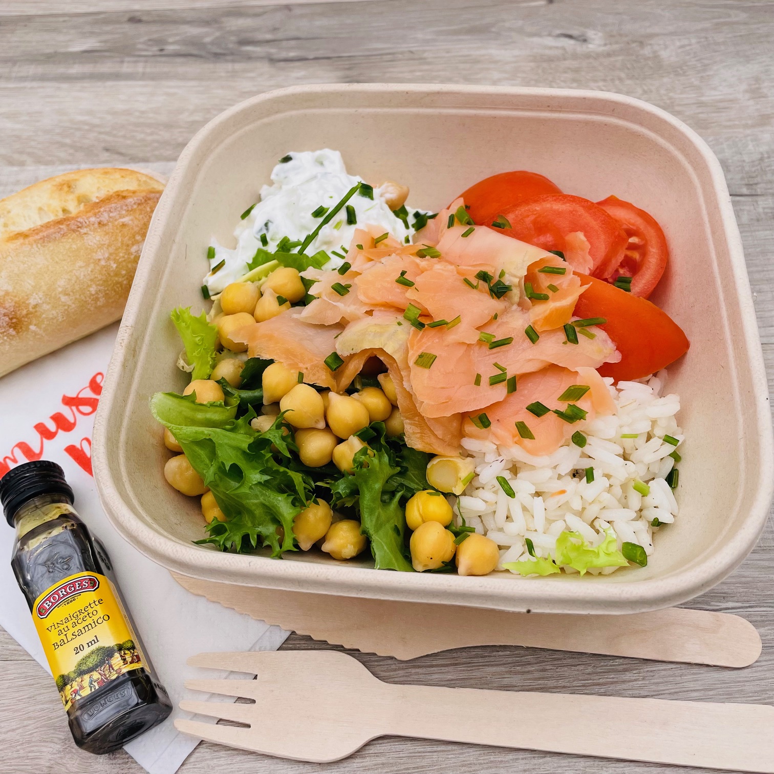 Riz, saumon fumé, tartare de concombre sauce tzatzíki, pois chiches, tomates, salade.