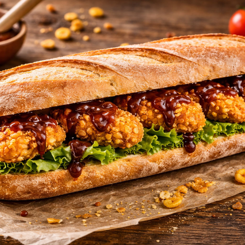 Filets de poulet origine France pané au maïs, sauce barbecue, salade dans un pain tradition.