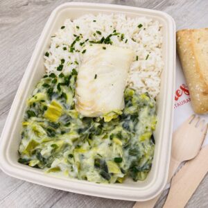 Riz, fondue de poireaux à la crème.(à réchauffer 3 min)
