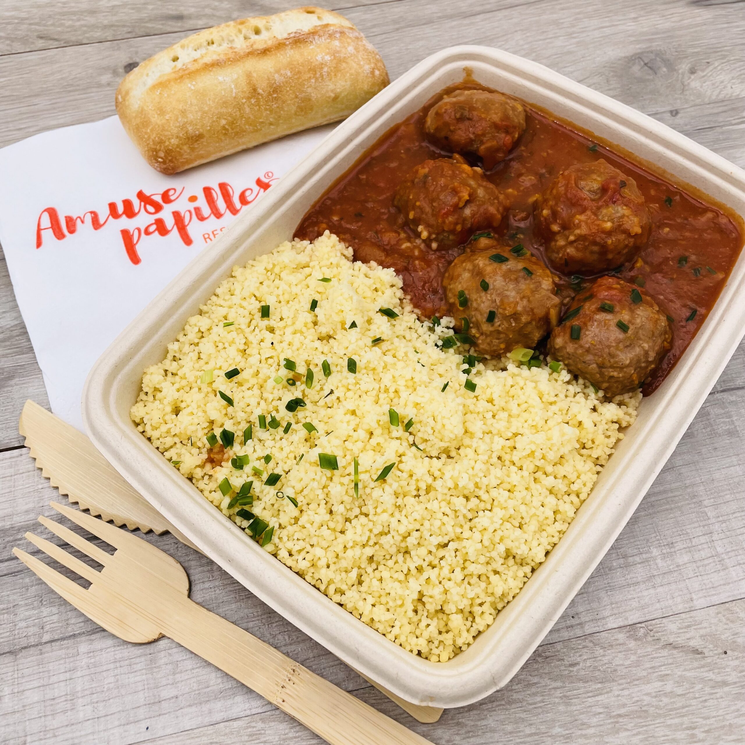 Boulettes de bœuf, semoule, sauce tomate au piment d’Espelette, emmental