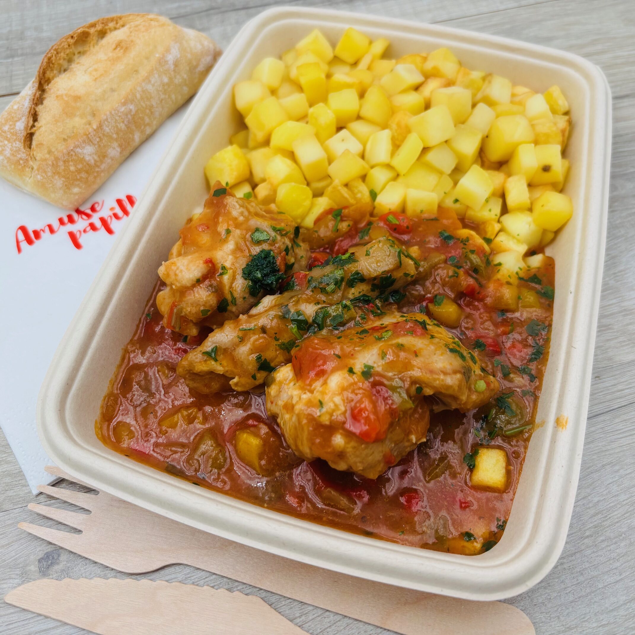 Sauté de poulet cuit à l’étouffé dans une sauce basquaise (coulis de tomate, huile d’olive, poivrons, oignon et épices), accompagné de pommes de terre rissolées.