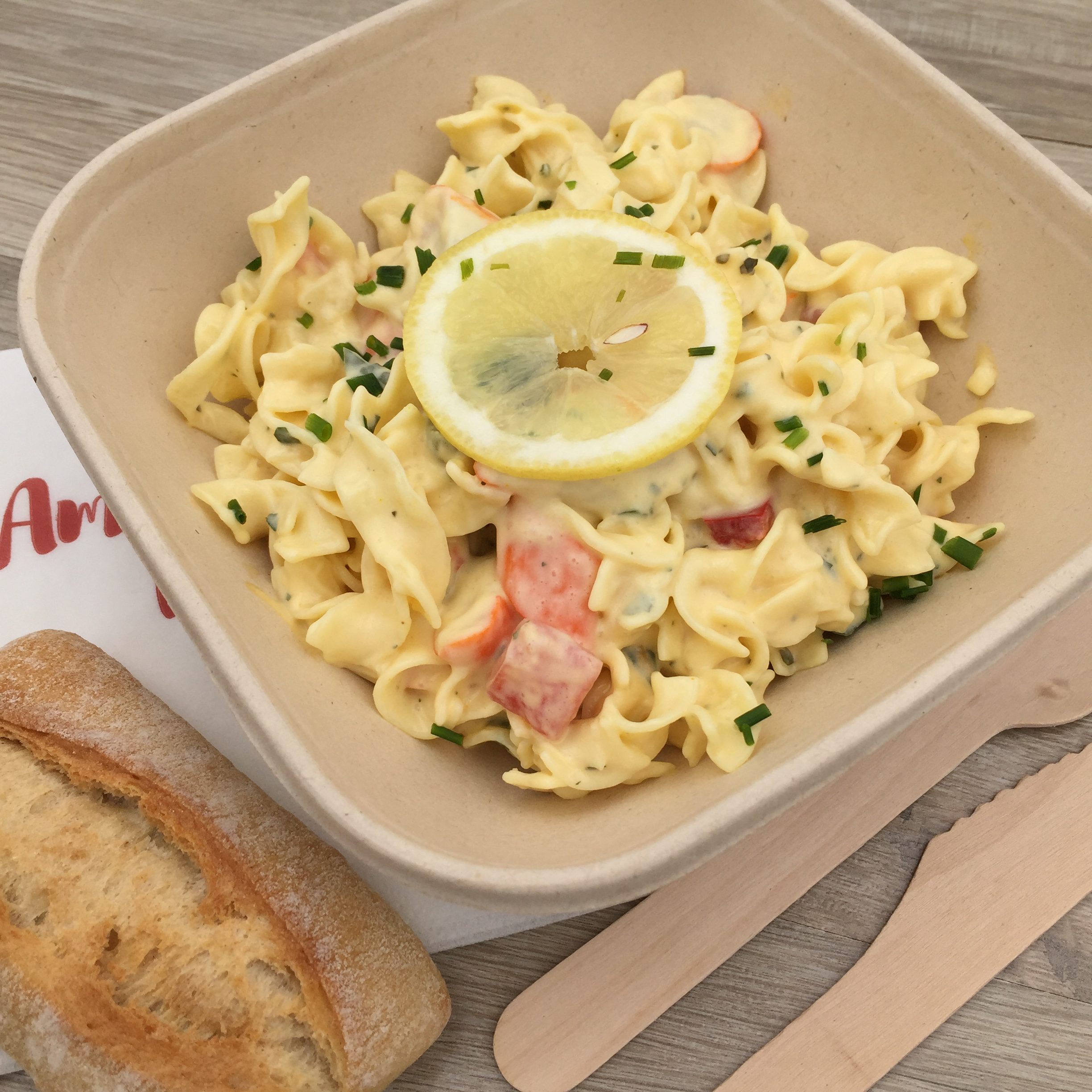 Pâtes au surimi, concombres et tomates, emmental sauce au fromage blanc –salade assaisonnée